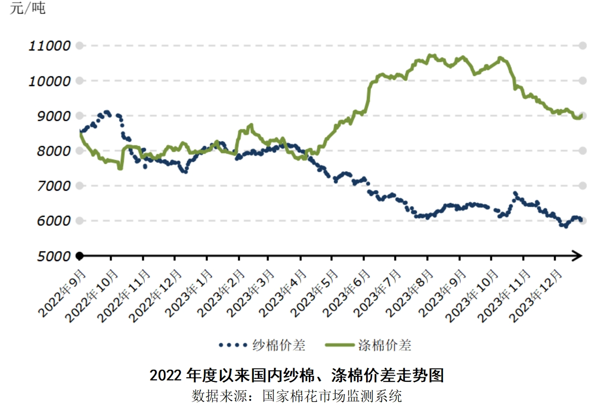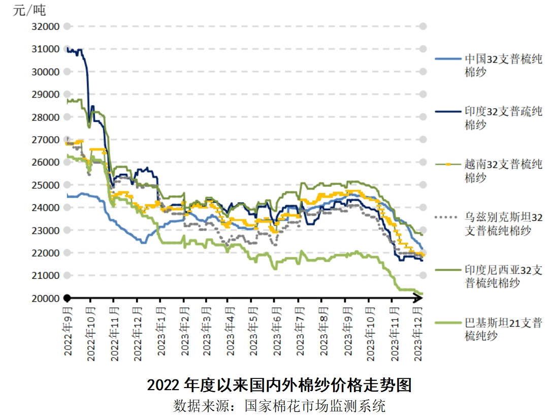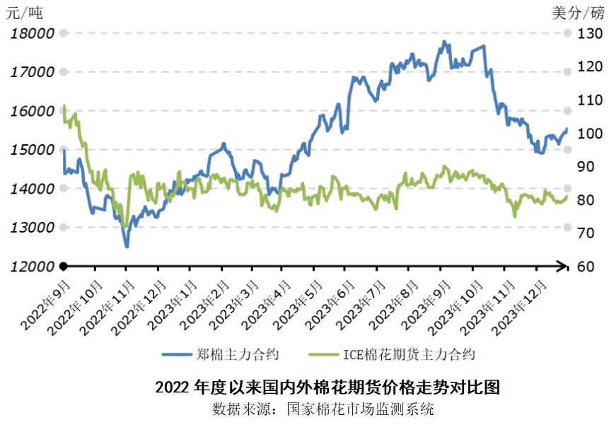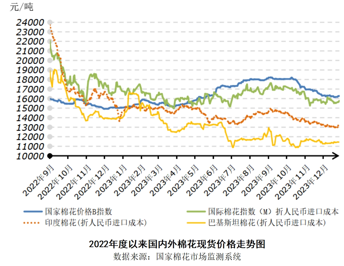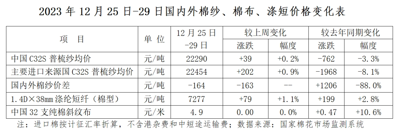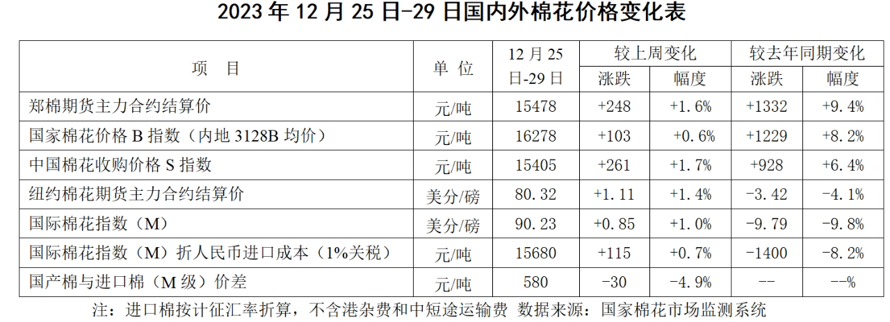 二、國(guó)際棉花價(jià)格上漲美元下跌,結(jié)合谷物、金屬、國(guó)際油價(jià)走高,ICE棉花期貨價(jià)格小幅上漲。印度和烏茲別克斯坦產(chǎn)量預(yù)測(cè)下調(diào),美國(guó)農(nóng)業(yè)部12月份預(yù)測(cè)2023/24年度印度棉花產(chǎn)量為2500萬(wàn)包,同比減少130萬(wàn)包。美國(guó)農(nóng)業(yè)部海外農(nóng)業(yè)服務(wù)局發(fā)布的最新參贊報(bào)告顯示,2023/24年度烏茲別克斯坦植棉面積為95萬(wàn)公頃,同比減少3%。12月25日-29日,紐約棉花期貨主力合約結(jié)算均價(jià)80.32美分/磅,較前周上漲1.11美分/磅,漲幅1.4%;代表進(jìn)口棉中國(guó)主港到岸均價(jià)的國(guó)際棉花指數(shù)(M)均價(jià)90.23美分/磅,較前周上漲0.85美分/磅,漲幅1.0%;折人民幣進(jìn)口成本15680元/噸(按1%關(guān)稅計(jì)算,不含港雜和運(yùn)費(fèi)),較前周上漲115元/噸,漲幅0.7%。國(guó)內(nèi)棉價(jià)比國(guó)際棉價(jià)高580元/噸,價(jià)差較前周縮小30元/噸。